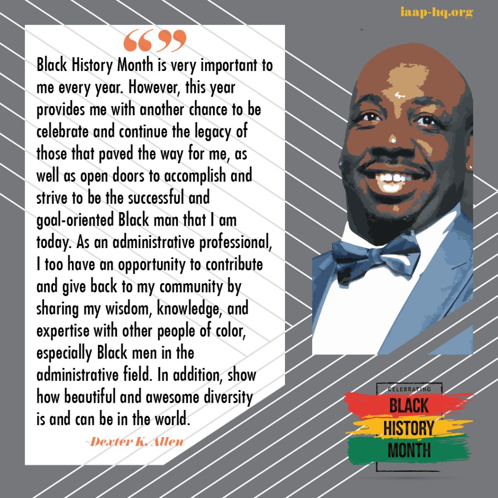 Black History Month is very important to me every year. However, this year provides me with another chance to be celebrate and continue the legacy of those that paved the way for me, as well as open doors to accomplish and strive to be the successful and goal-oriented Black man that I am today. As an administrative professional, I too have an opportunity to contribute and give back to my community by sharing my wisdom, knowledge, and expertise with other people of color, especially Black men in the administrative field. In addition, show how beautiful and awesome diversity is and can be in the world.